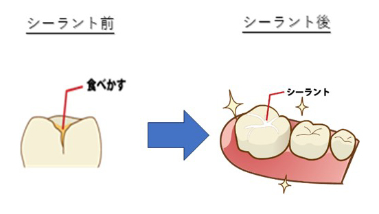 シーラント材にはフッ素が含まれているものが多く、溝を埋めて汚れが溜まりにくくするだけでなく、 フッ素によるむし歯予防効果も期待できます。