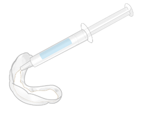 ホームホワイトニングでは、まず、歯科医院で歯型を取り、歯型に合わせて専用のマウスピースを作製します。 マウスピースの適合を確認したのち、ご自宅にてマウスピースに薬剤を入れて装着します。