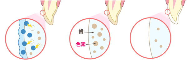 ご自宅での歯磨きや、歯科医院でのブラシや粉を用いた清掃によって、歯の表面に付着した色素を取り除くことはできますが、歯の内部にある色素を落とすことはできません。